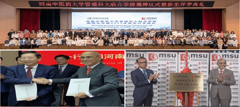 学院以党建为统领,做到党建和业务工作同谋划、同部署、同落实,以党建高质量引领事业发展高质量。一是建立中马例会制度,推动教育融合发展。双方每月召开工作例会,了解学生诉求,反馈教育教学,互通互享教学资源,确保双方教学质量稳步提升。二是坚持“引进走出”同行,打造国际化师资队伍。安排马方外教来我校线下授课,开展外教与助教老师集体教研,构建“外教+助教+助管”三位一体教育教学新模式;选派中方教师赴马方授课,参与马方教学活动与学生管理,打造“双语+国际”师资队伍。三是坚持以文化人,增强跨文化沟通能力。立足“双校园”办学特色,建设“中医药文化双语传播”育人项目,充分发挥海外留学生自身优势,讲述好中医药故事、传播好中医药声音、传扬好中医药精神,不断提高中医药在国际上的影响力。四是加强“双创”指导,助力国际化中医药人才培养。组织科研竞赛知识讲座、院系竞赛活动,经过不懈努力,我院学生在各类科研创新比赛中荣获多项国家级、省级荣誉,参与发表多篇SCI等高水平论文。五是加强合作交流,提高办学水平。定期邀请MSU专家做客我校百家讲坛,拓宽学生国际视野。开展互访交流,学习借鉴国外先进教育教学理念,不断提升学院办学的国际化和现代化水平。